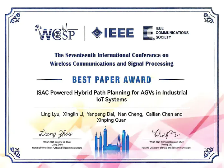 在2025年第十七届国际无线通信与信号处理会议(WCSP)的论文评选中,团队论文《ISAC Powered Hybrid Path Planning for AGVs in Industrial IoT Systems》围绕工业物联网系统中自动导引车(AGV)的路径规划,提出基于集成感知与通信(ISAC)的混合路径规划方法。经严格学术评审,论文从大量投稿中脱颖而出,斩获本次会议最佳论文奖。