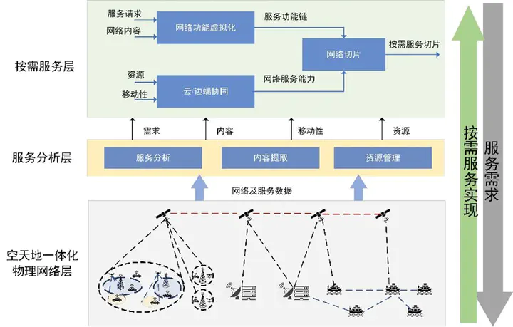 随着网络的快速发展以及用户需求日趋多样化与差异化,未来网络服务需求将不仅限于传输速率、空口时延、移动性、连接密度、频谱效率等传统业务指标,更需要从网络覆盖、定位精度、网络智能水平、成本效率等维度综合考虑,以实现“服务定制化,网络智能化”的关键目标。为此,本课题中提出了一个面向按需服务的空天地一体化网络服务管理架构。该架构由按需服务层、服务分析层和空天地一体化物理网络层组成。目前,本团队主要关注按需服务层及其相关技术细节,并针对其中两大关键技术——异构资源编排技术与云边端协同技术已经做了较为全面的理论分析。